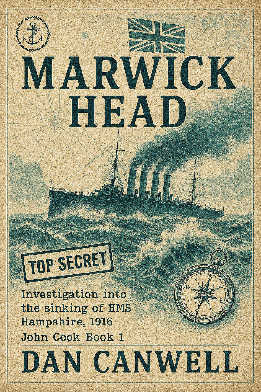 Marwick Head is the fist book in a new series featuring Captain John Cook and his valued assistant Matthew Nicholson as they both come to terms with one of the most shocking and unpredictable incidents of World War One - the sinking of the cruiser HMS Hampshire just off the Orkney Isles. On board the Ship was the formidable Field Marshal H Kitchener on a secret mission to Russia. There were 12 survivors out of over 700 men aboard that night . Kitchener was not among them.